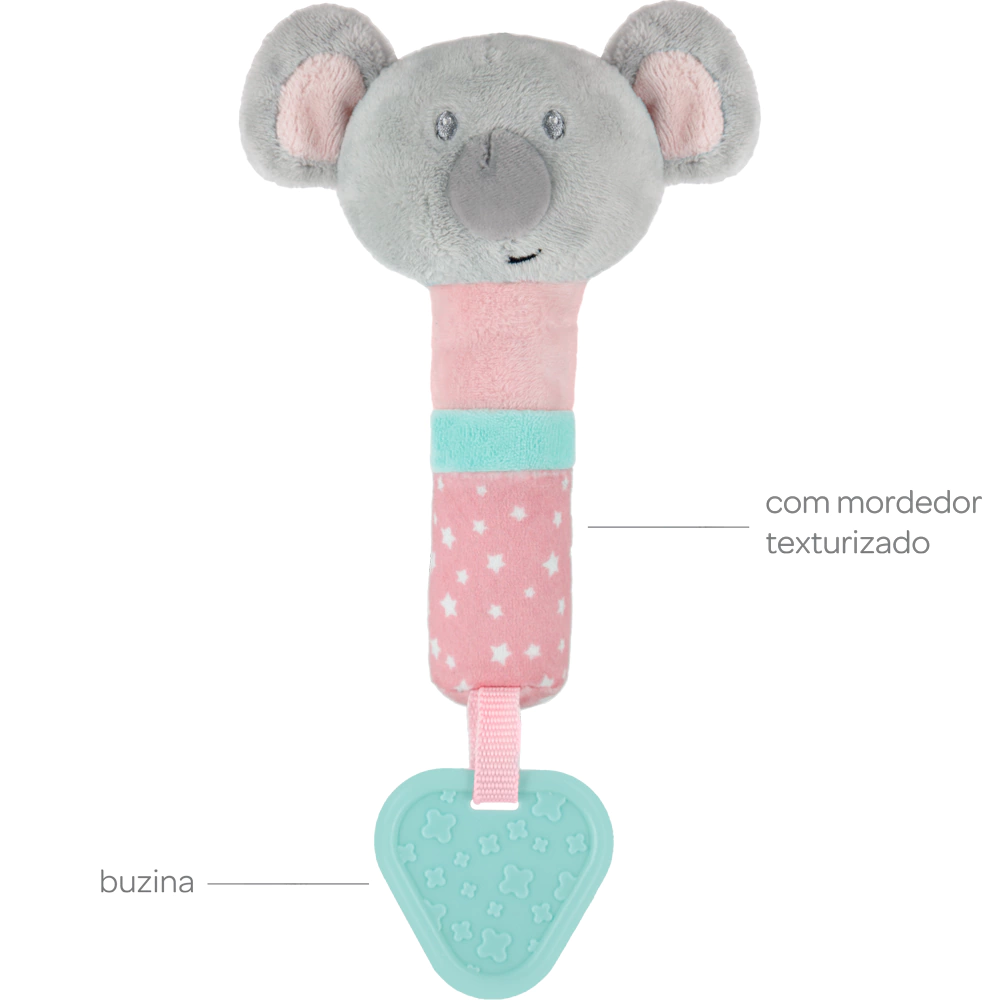 A Buzininha com Mordedor Coala Buba é um companheiro perfeito para o dia a dia do seu bebê, fácil de segurar e manusear, promovendo a coordenação motora fina.