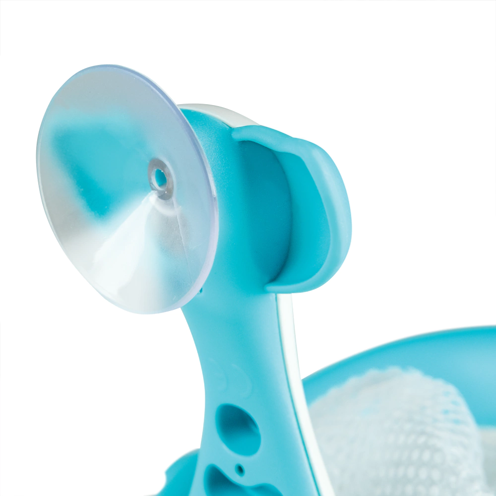 Para instalar, utilize a ventosa e o fixador articulável para prender a cesta firmemente nos azulejos do banheiro, em uma altura acessível para a criança.