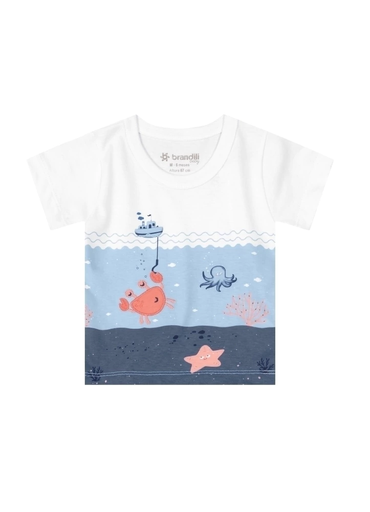 Estampa Temática Fundo do Mar: O design lúdico com caranguejo, estrela do mar e polvo estimula a curiosidade e a diversão, tornando a roupa parte da brincadeira.