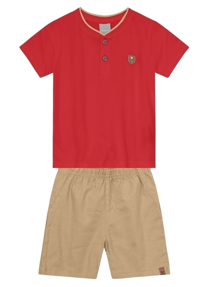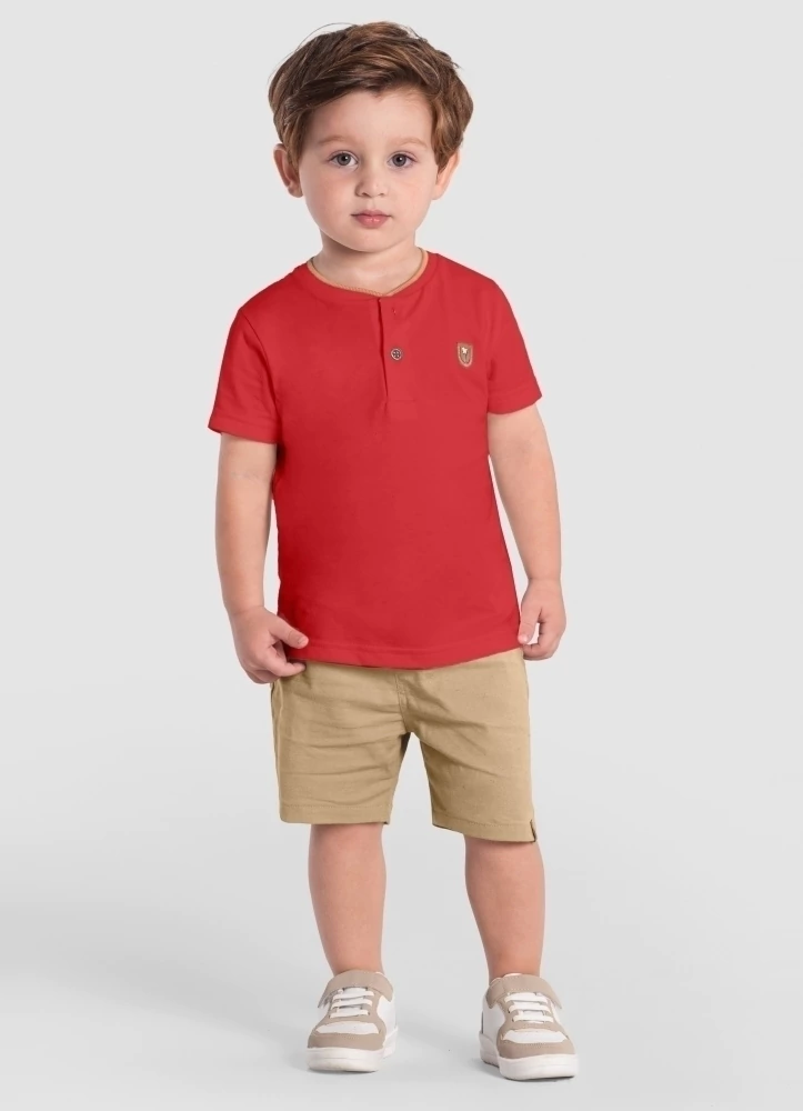 Combine o conjunto com tênis ou sandálias para um look prático e estiloso, ideal para qualquer ocasião, seja uma visita ao parque ou uma festinha de aniversário. O vermelho marcante vai deixar seu pequeno ainda mais charmoso!