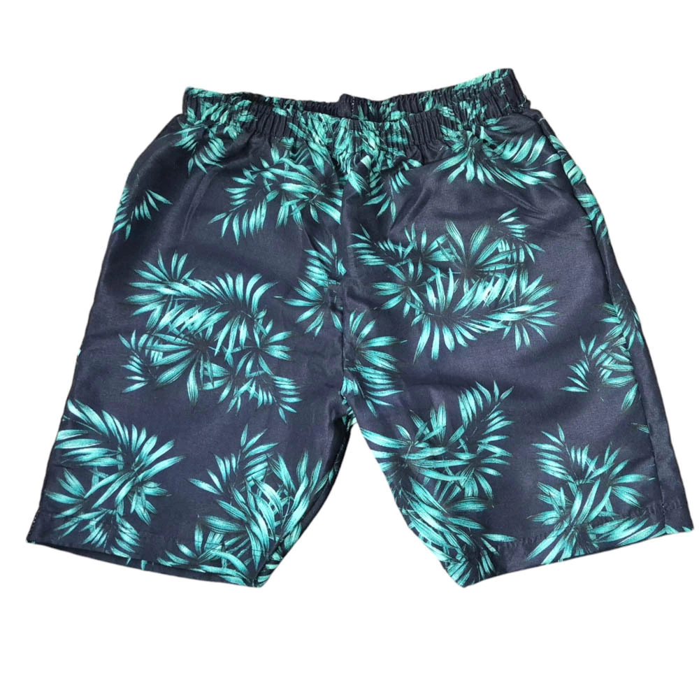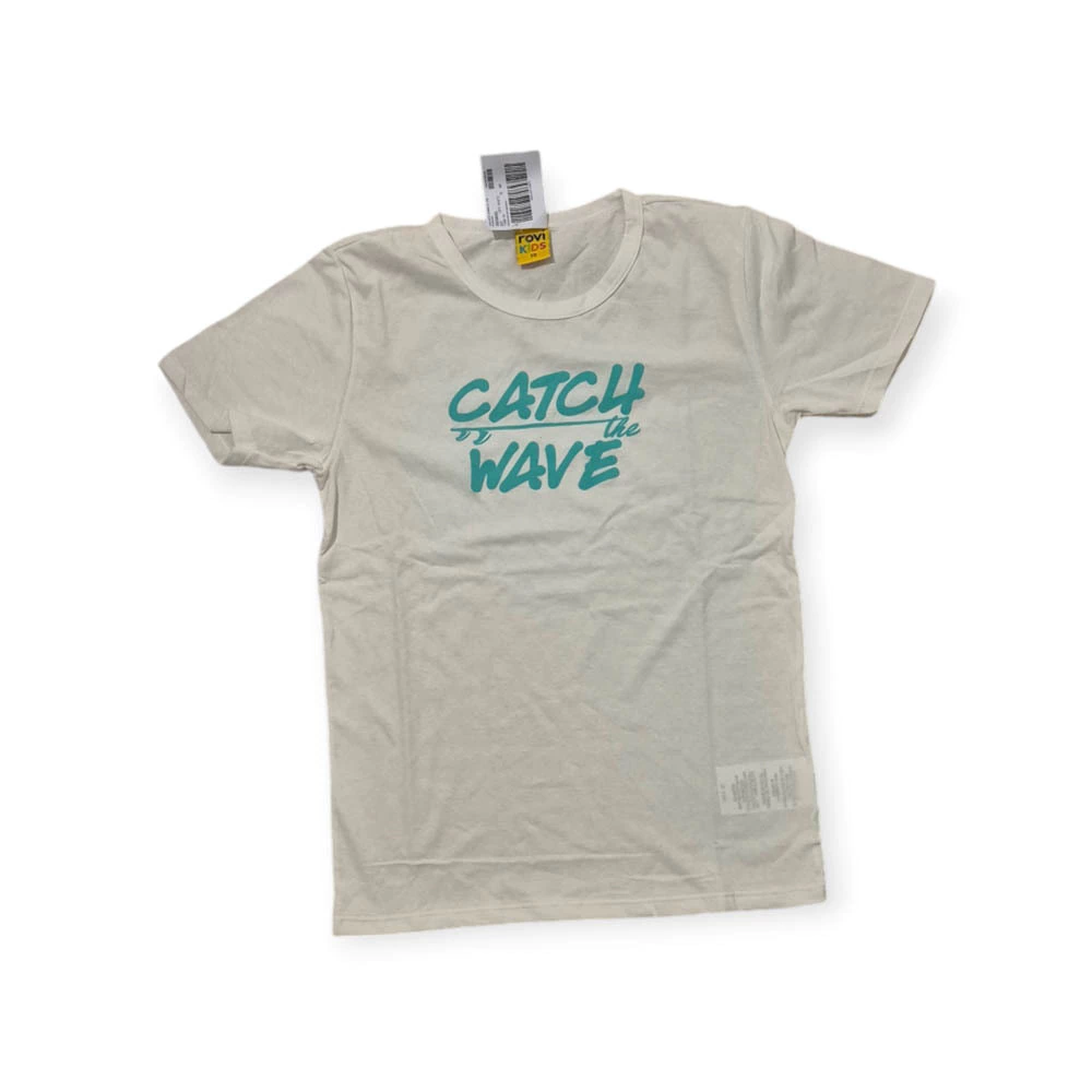A camiseta apresenta a divertida escrita "CATCH the WAVE" (Pegue a onda), que traz um toque de aventura e descontração ao look. Já a bermuda azul marinho, adornada com uma charmosa estampa de coqueiros, é ideal para dias de diversão na praia ou no parque.