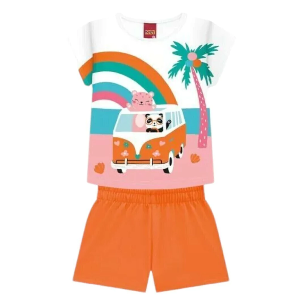 Blusa: Nas cores branca e laranja, a blusa apresenta uma adorável estampa de bichinhos e arco-íris, que vai encantar as crianças! Com decote arredondado e manga curta, ela proporciona liberdade de movimento e frescor.