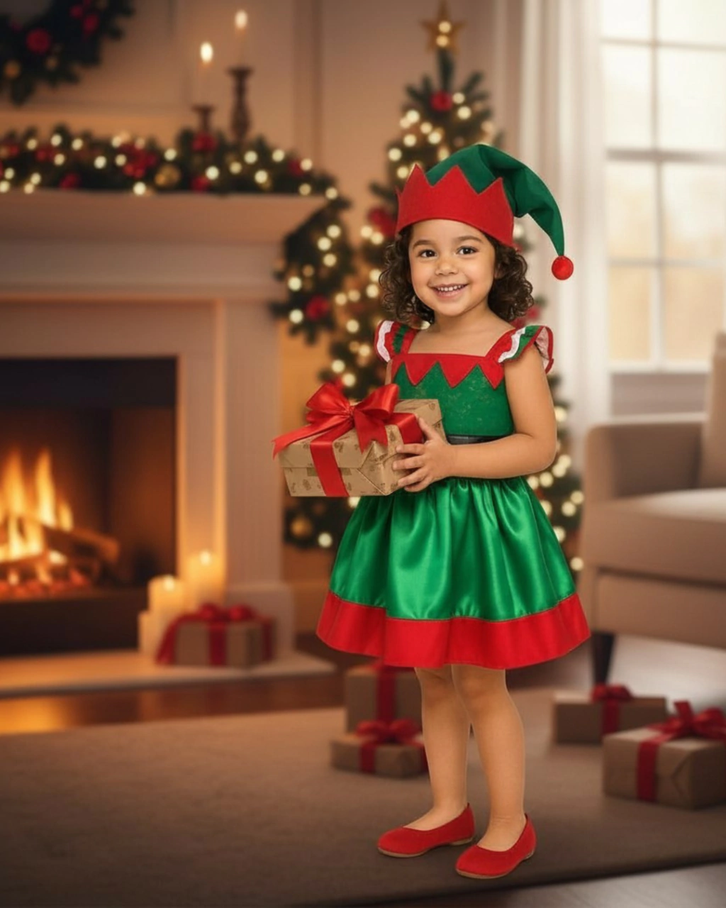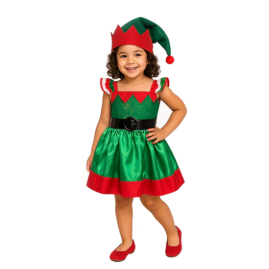 O conjunto vem com vestido verde e vermelho, cinto preto e gorro pontudo com pompom — um look completo para arrasar em festas, fotos ou apresentações.