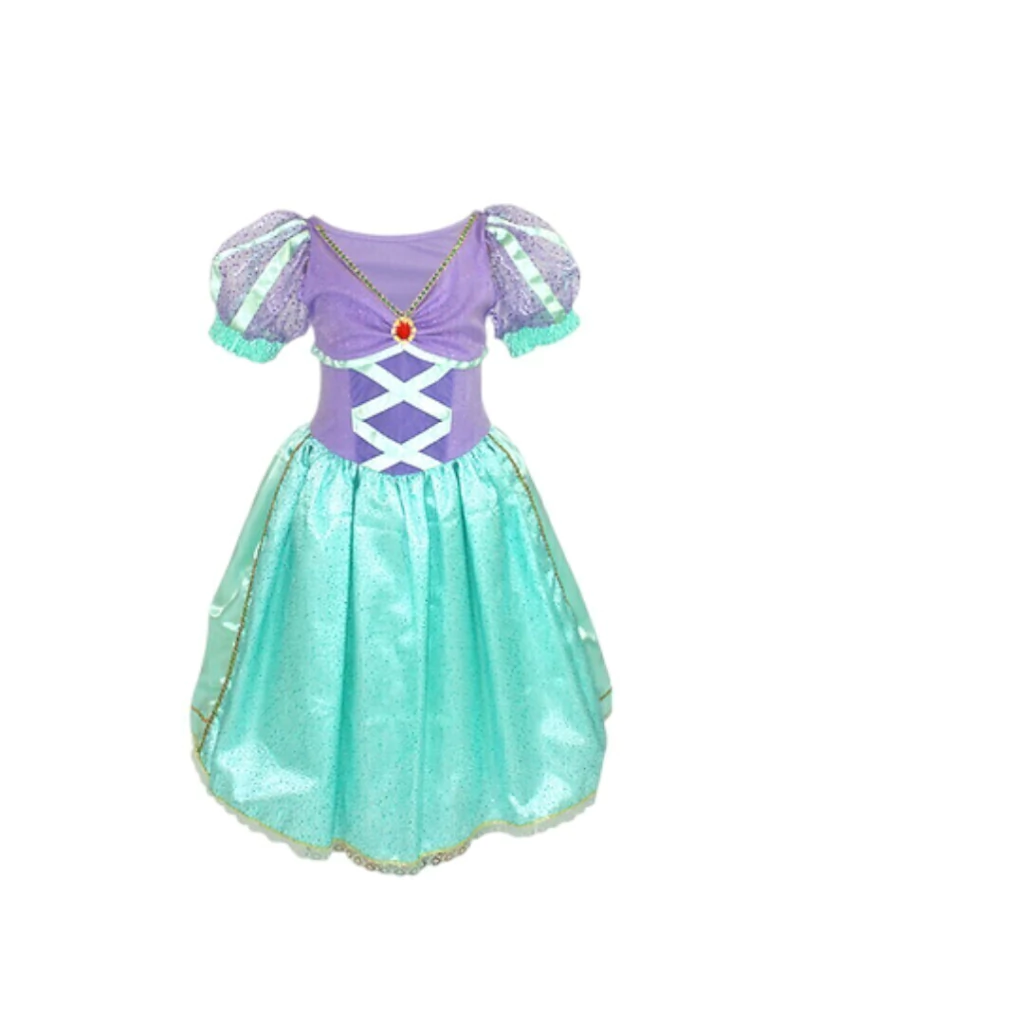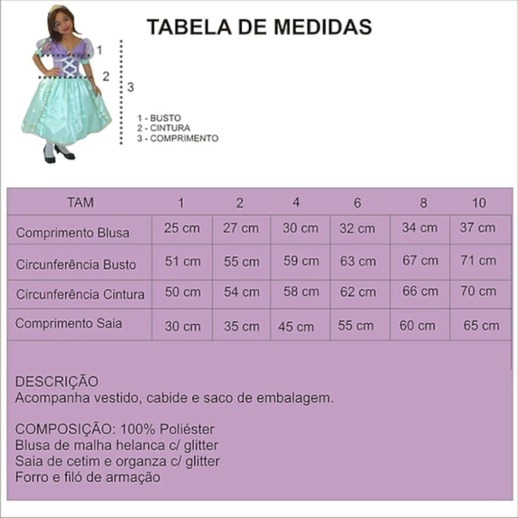Descrição: Transforme sua pequena na encantadora Sereia com esta fantasia mágica. O conjunto inclui um lindo vestido verde e lilás com detalhes em renda e cetim,