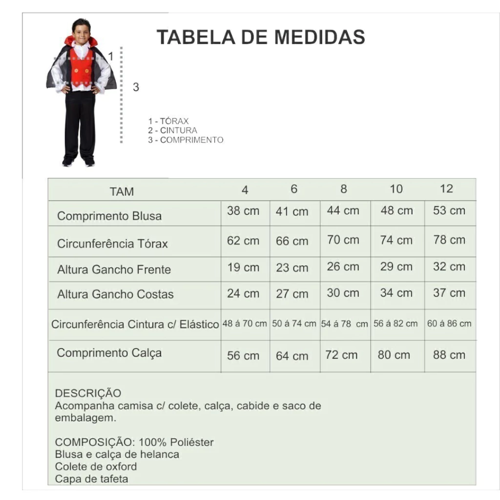 Com medidas detalhadas para melhor ajuste ao corpo, essa fantasia foi pensada para oferecer conforto e estilo. Confira a tabela de medidas nas imagens escolha o tamanho ideal para seu pequeno.