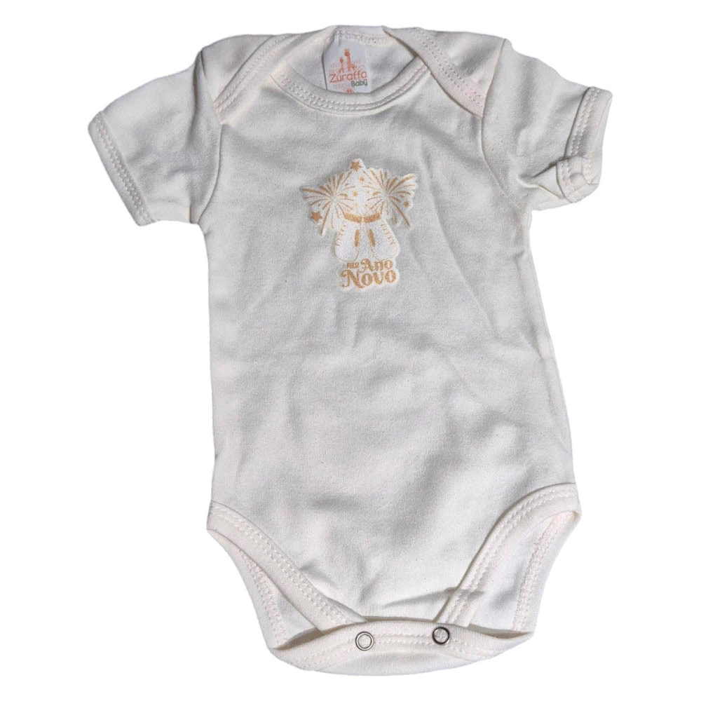 Body de Ano Novo: Este body off-white é adornado com a frase "Meu Primeiro Ano Novo", marcando com alegria a virada do ano do seu bebê.