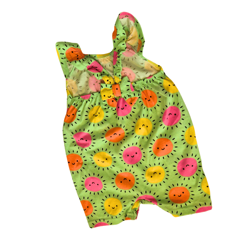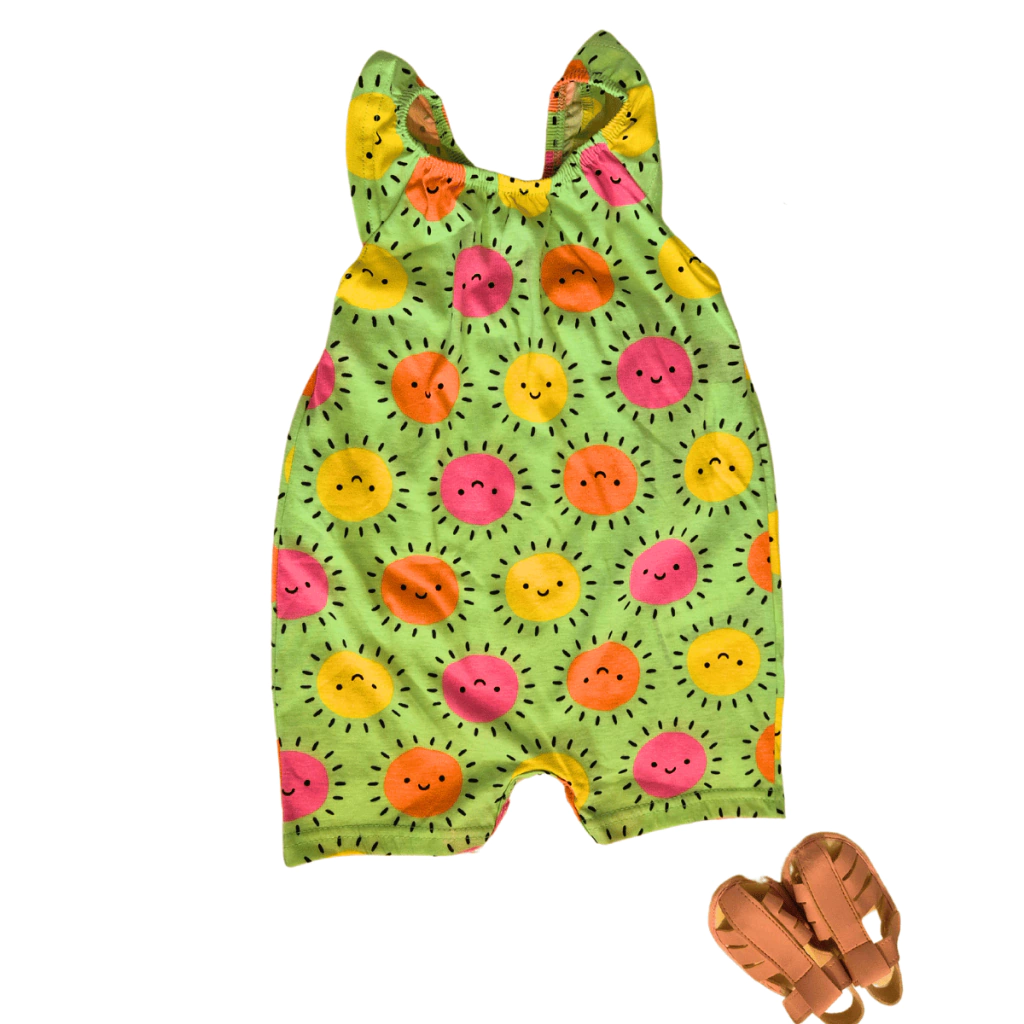 O segundo macaquinho, nas cores verde e amarela, também não fica atrás! Com uma estampa de sol alegre, ele garante que sua pequena esteja sempre radiante. Assim como o primeiro, possui decote arredondado, alças largas e fechamento prático entrepernas.