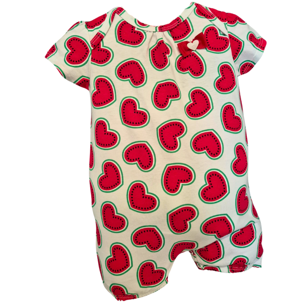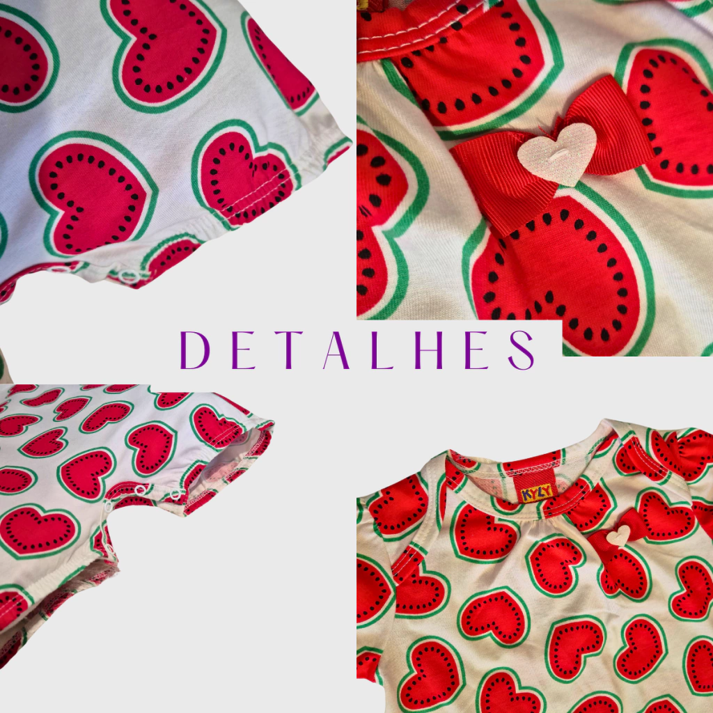 O primeiro macaquinho, nas cores off white e vermelha, apresenta uma adorável estampa de corações que traz um toque de amor e alegria para o visual. Com decote arredondado e mangas curtas, ele é perfeito para os dias mais quentes. O fechamento entrepernas por botões facilita na hora de vestir.