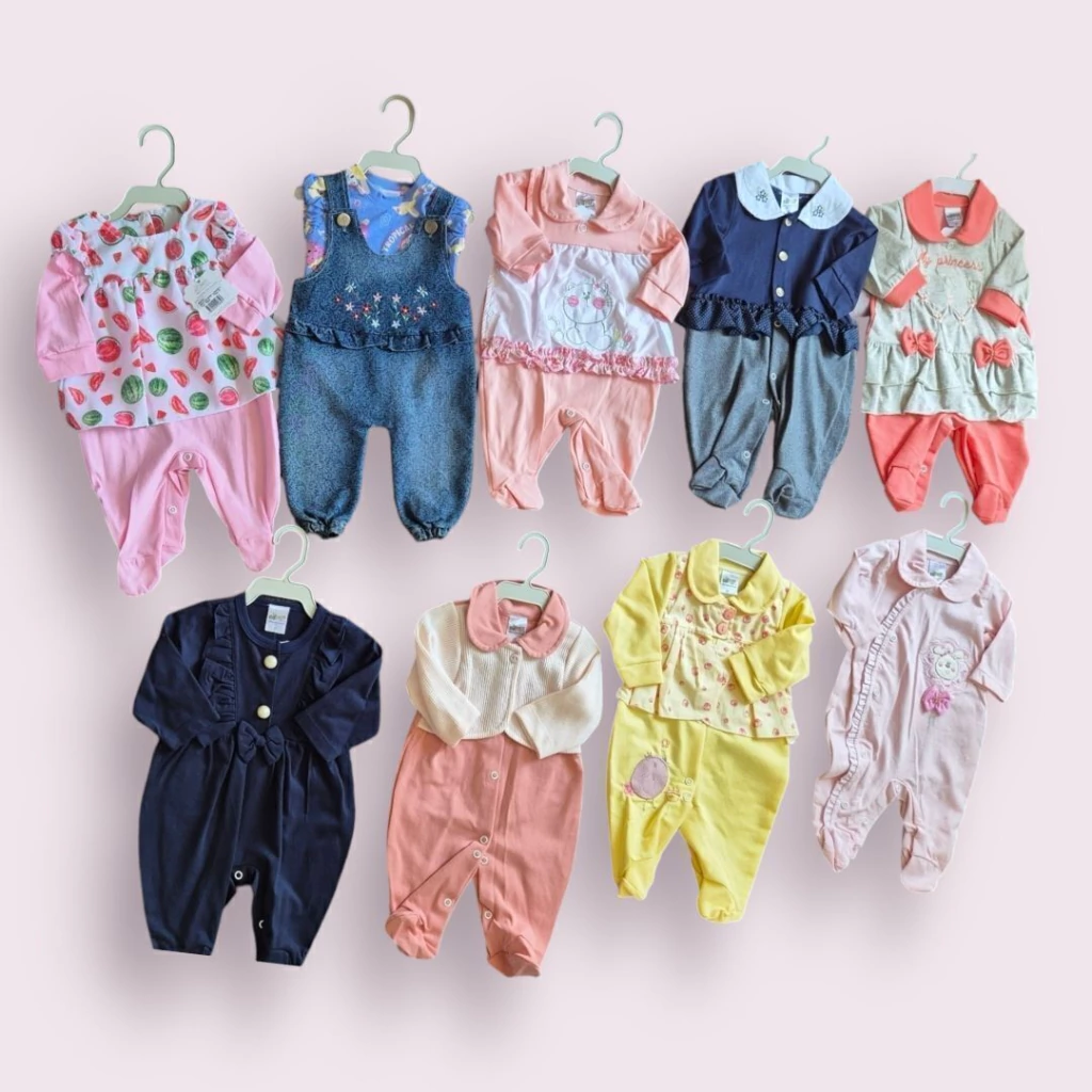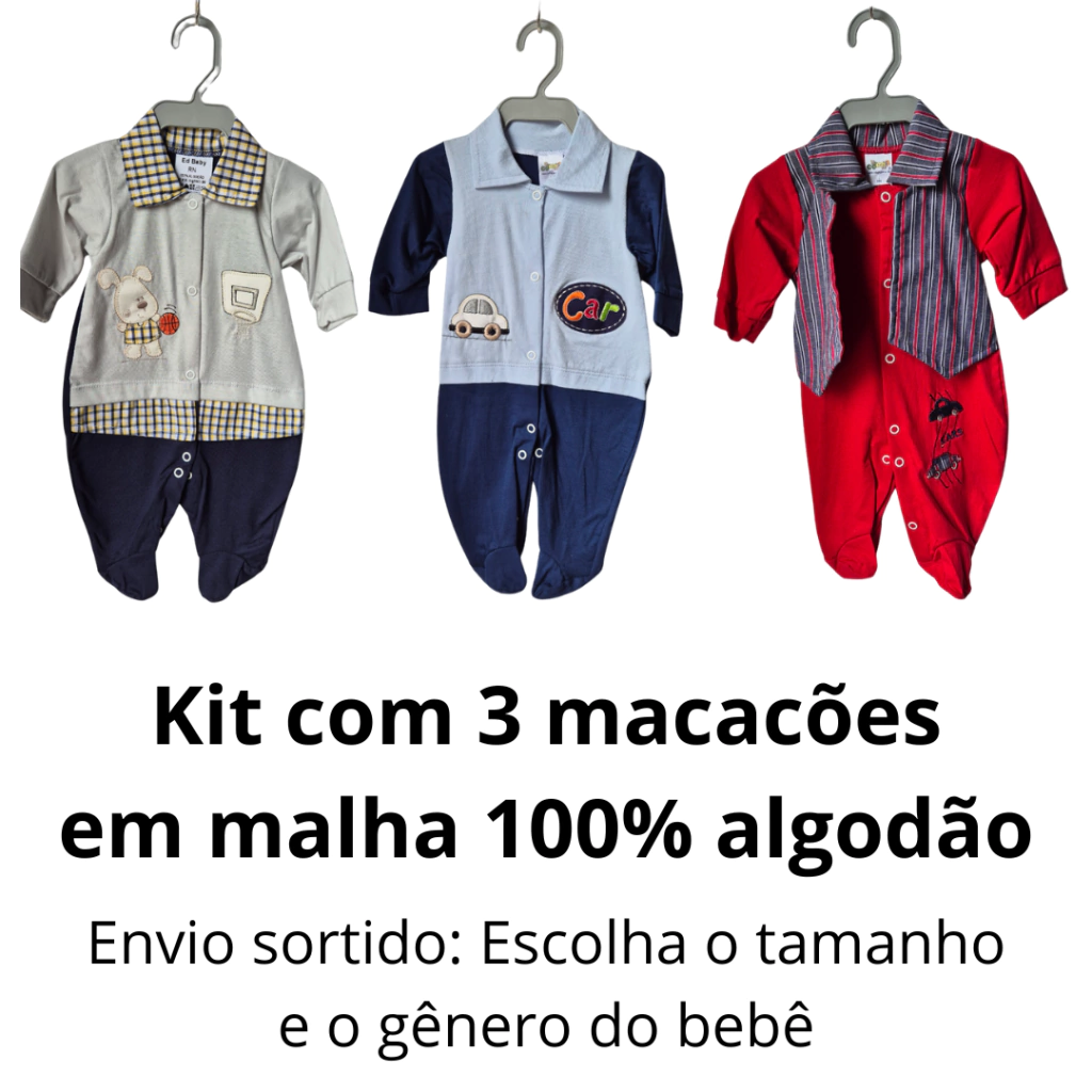 **Obs.: O KIT de macacão é enviado sortido de acordo com o estoque para o gênero e tamanho escolhido na hora da compra, caso deseje nos envie uma mensagem dizendo suas preferências.**