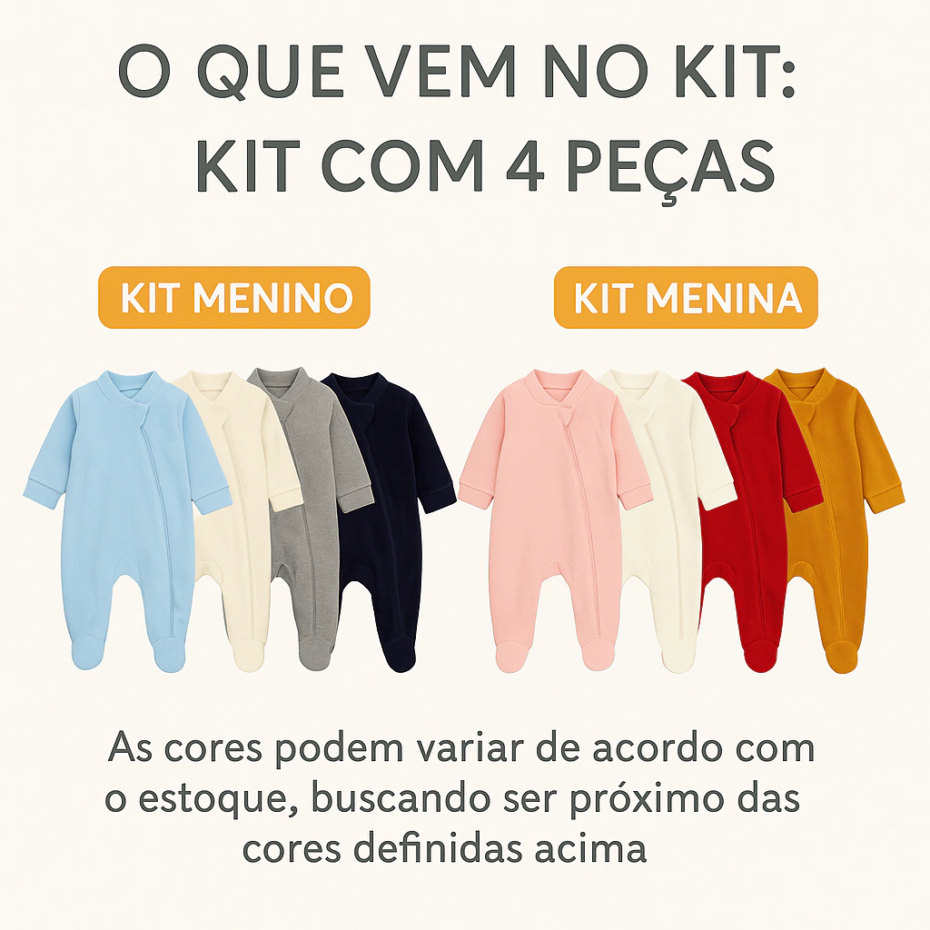 As cores podem variar conforme o estoque, mas sempre manteremos tons similares e harmônicos conforme o kit escolhido (menino ou menina).
