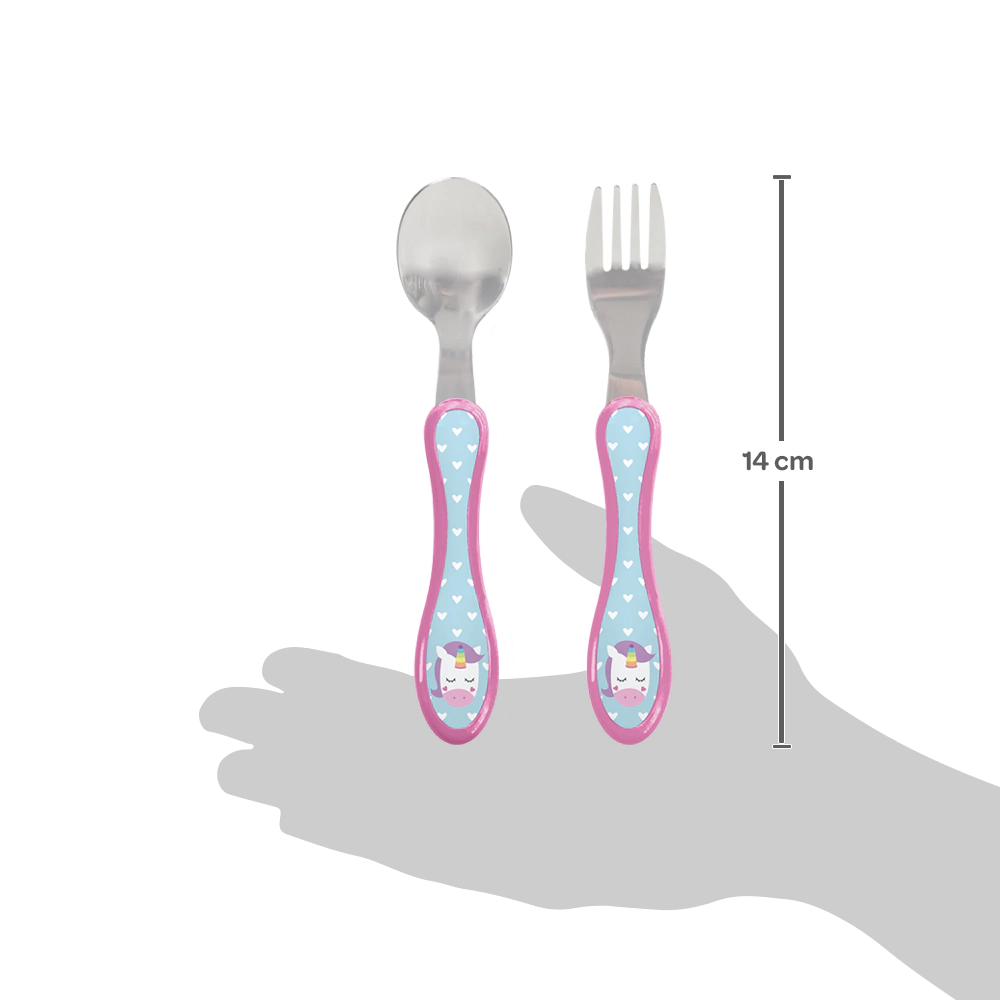 Cada talher mede aproximadamente 14 cm de comprimento, com o garfo tendo 2 cm de largura e a colher 3 cm de largura, e ambos com 1 cm de profundidade, proporcionando o tamanho ideal para a mão da criança e para a boca.
