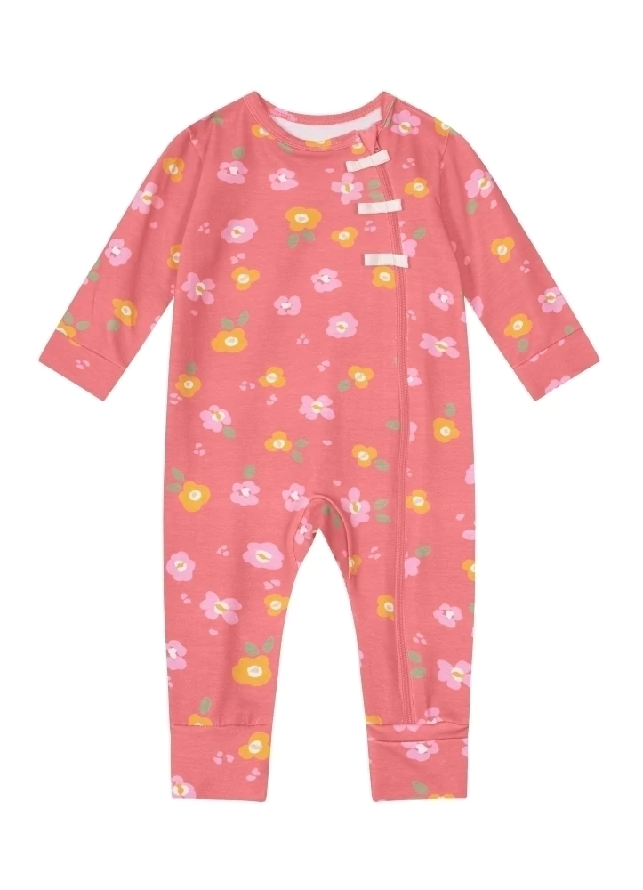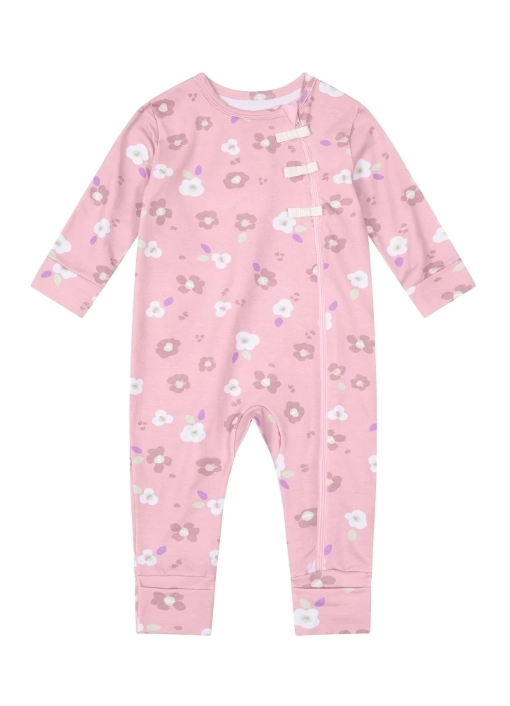A aplicação de laços decorativos e a estampa rotativa acrescentam um toque charmoso e feminino ao visual, enquanto os pés reversíveis, punhos e barra ajustados garantem um ajuste perfeito e aconchegante. Seu bebê ficará lindo e confortável em todas as ocasiões!