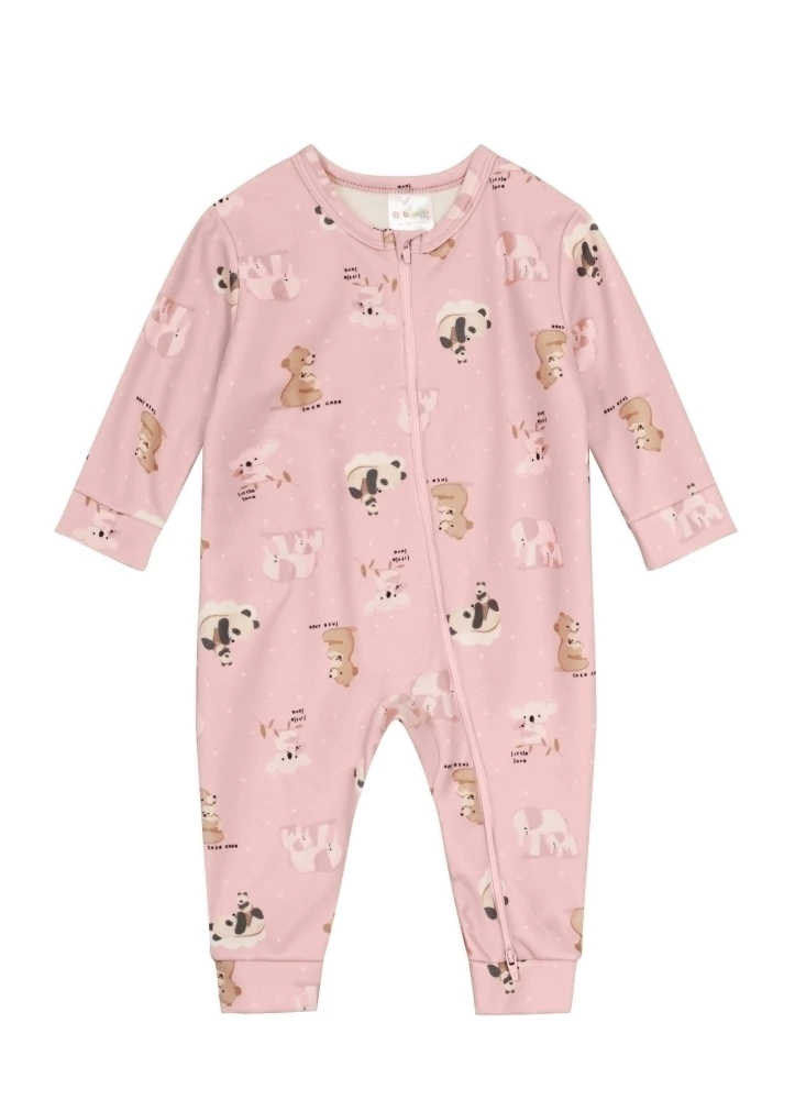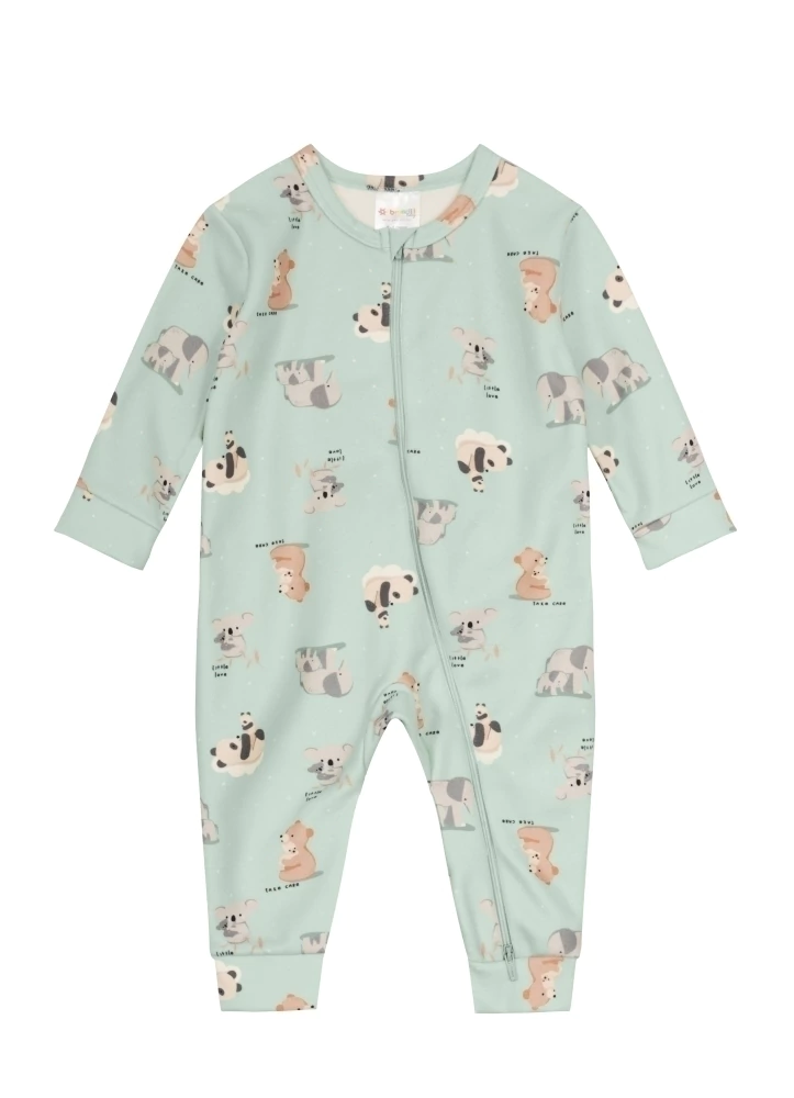 Fechamento frontal por zíper que simplifica a rotina de vestir e trocar fraldas, otimizando o tempo dos pais.