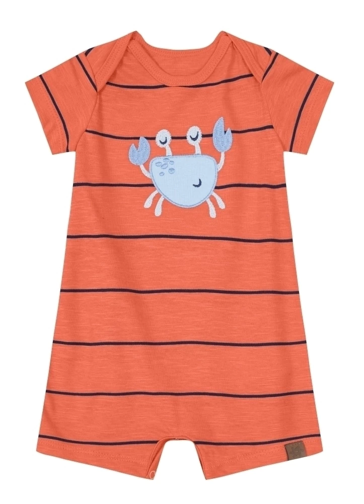 Apresentamos o Macaquinho de Bebê Bordado de Carangueijo, uma peça encantadora e super confortável para o seu pequeno! Feito em meia malha listrada, este macaquinho na cor laranja traz um lindo bordado de carangueijo, perfeito para destacar a fofura do seu menino.