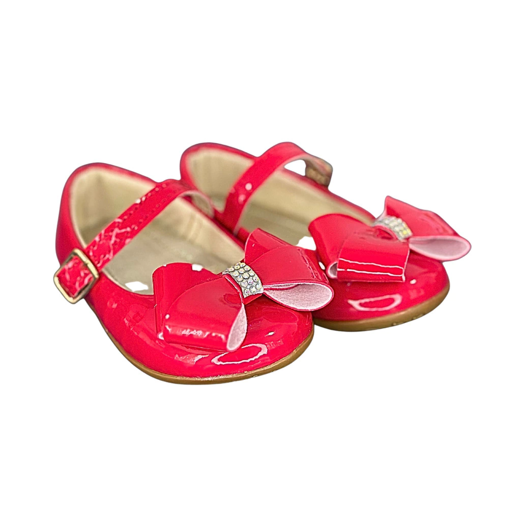 Laço e Strass: Variação vermelha vernizada com detalhe de laço e strass, ideal para diferentes estilos.