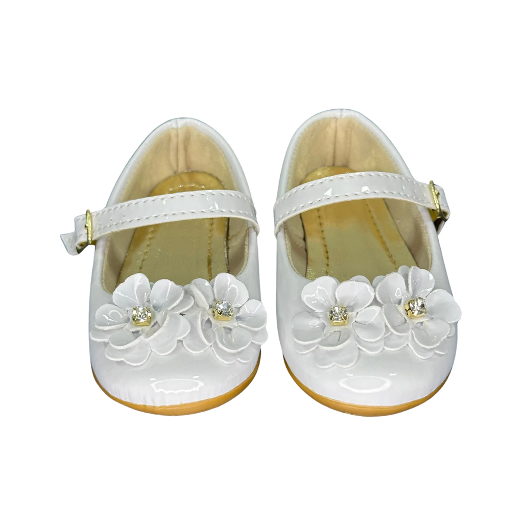 Aplique de Flor e Strass: Variação branca com detalhes delicados que tornam a sapatilha ainda mais encantadora.
