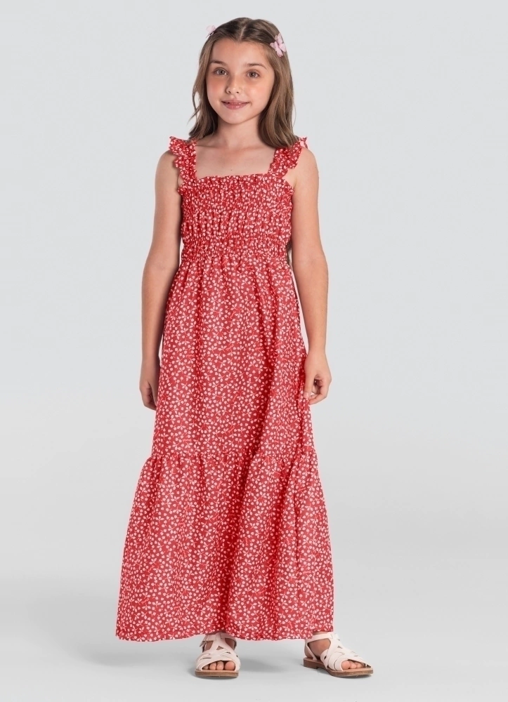 - **Material:** Confeccionado em crepe de poliéster com elastano, o vestido oferece um toque suave e confortável, ideal para a pele delicada das crianças.