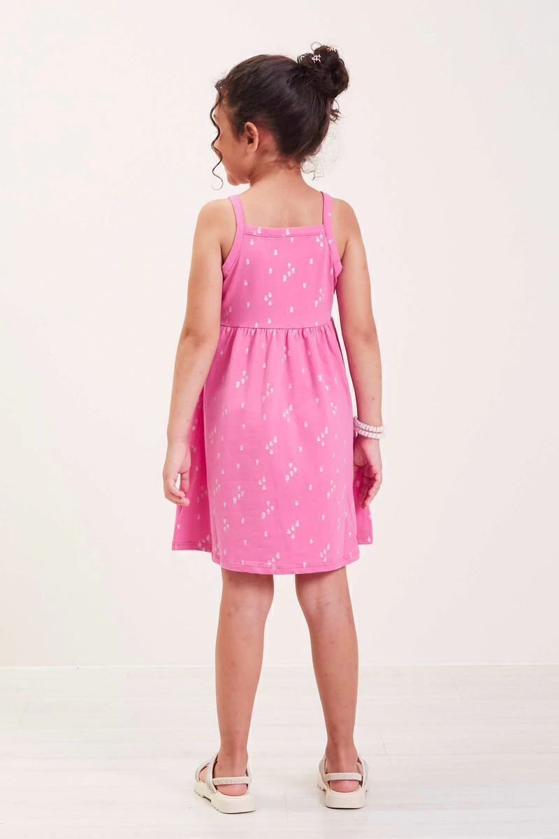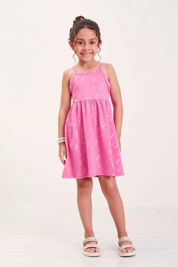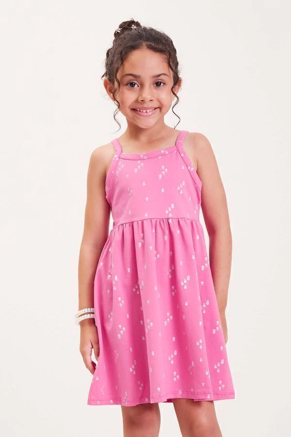 Este vestido infantil rosa estampado é a peça-chave para o guarda-roupa de verão, combinando facilmente com sandálias e acessórios.