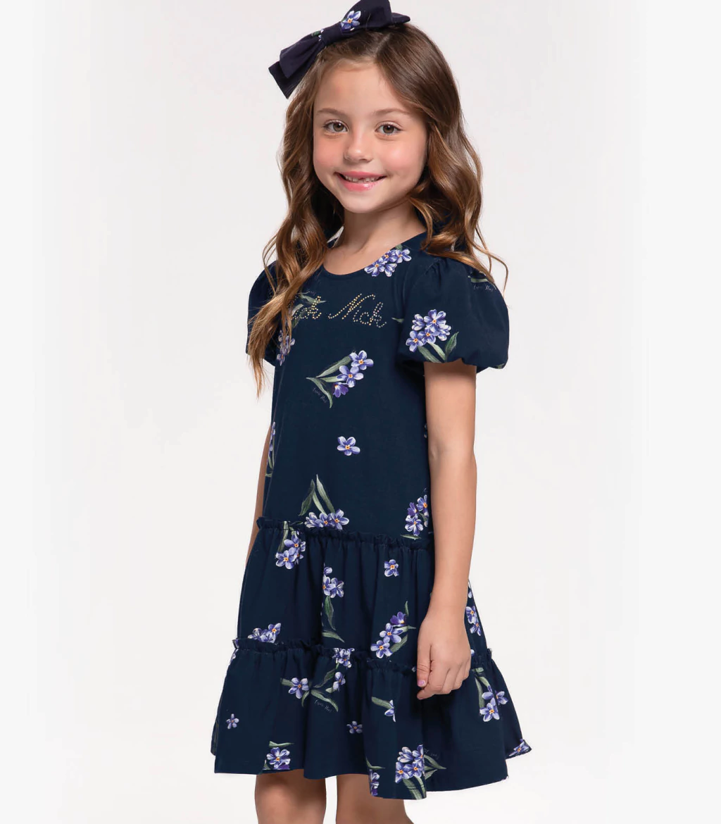 Nome: Vestido infantil Trick Nick estampado em cotton com aplique e babados
