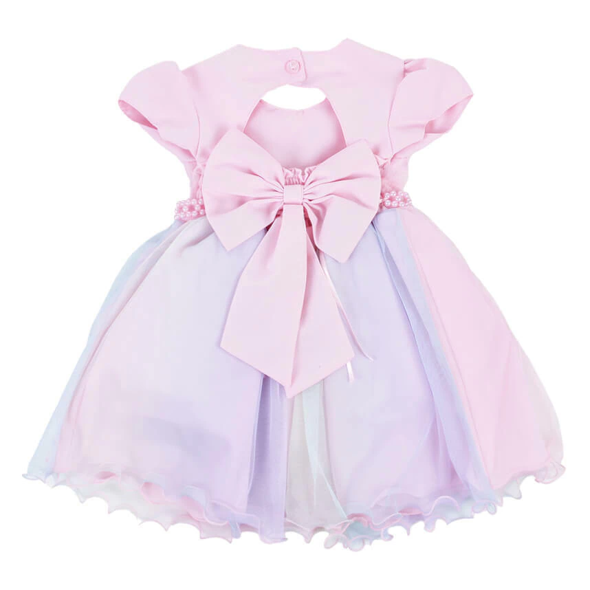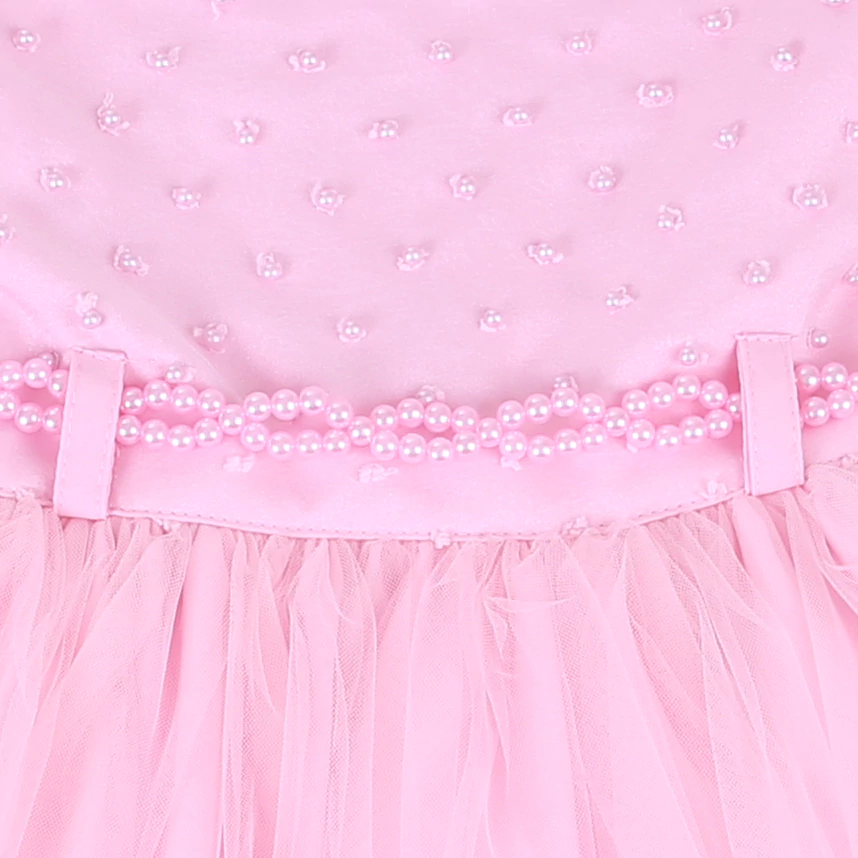 O cinto de pérolas e a saia de tule em cores de arco-íris adicionam um charme lúdico ao visual, enquanto o laço nas costas e as mangas curtas completam o design com um toque final adorável.