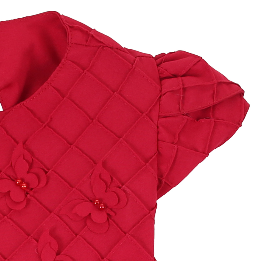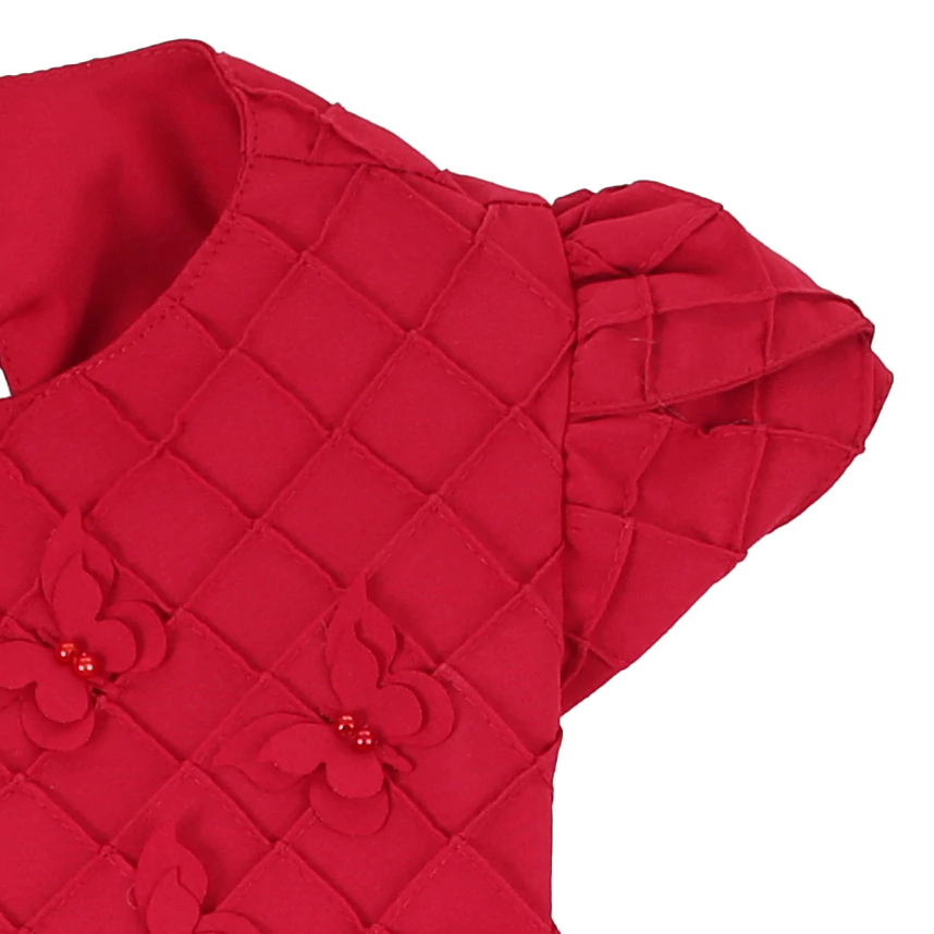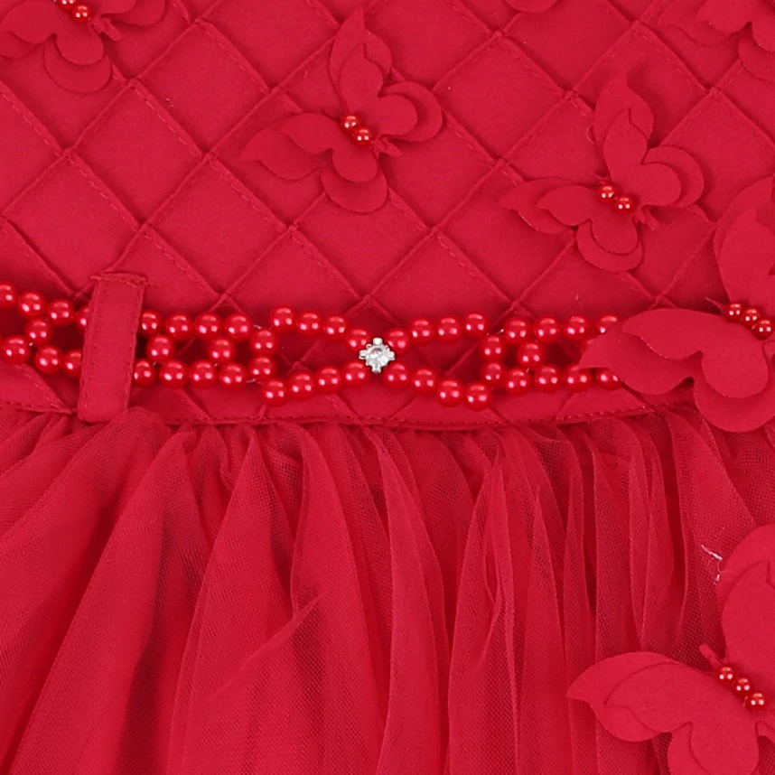 2) No modelo vermelho o vestido tem uma pala adornada por apliques de borboletas e pérolas. Na sai o vestido tem aplique lindo de borboletas.