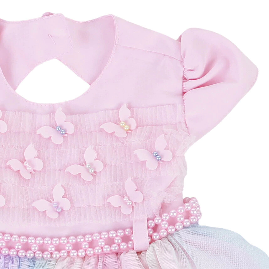 1) Rosa com saia Arco-íris o vestido tem uma pala adornada por apliques de borboletas e pérolas.